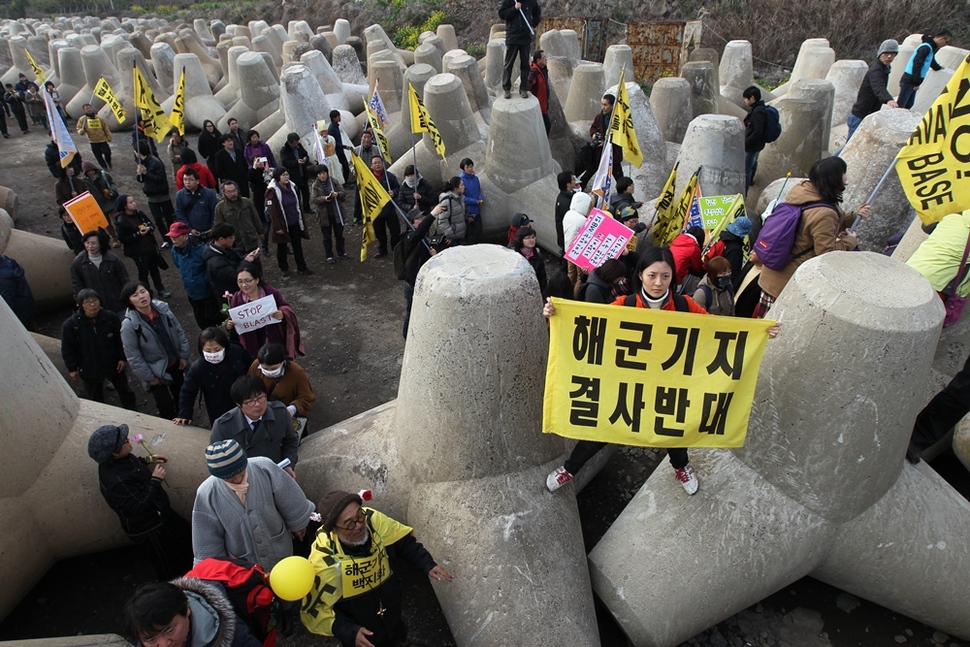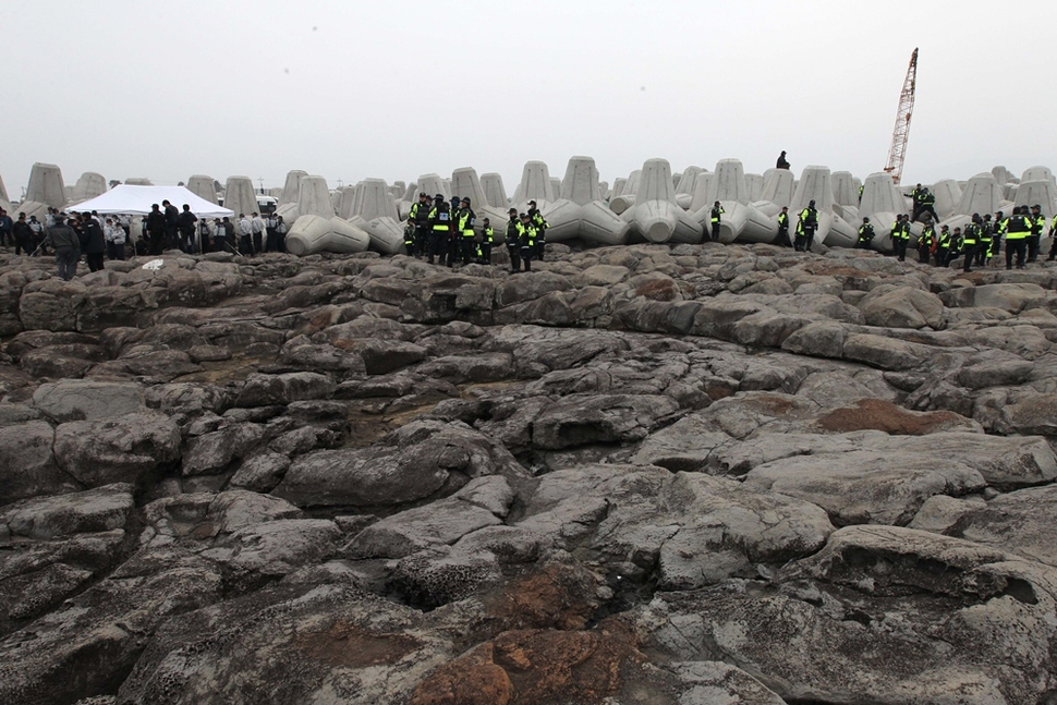 2012년 3월7일 오전 제주해군기지사업단의 강정마을 구럼비 바위 발파 작업을 막으려는 주민과 활동가들이 경찰과 대치하고 있다. 천주교정의구현전국사제단과 시민활동가들이 경찰에 의해 끌려나왔고 10여 명은 연행됐다.