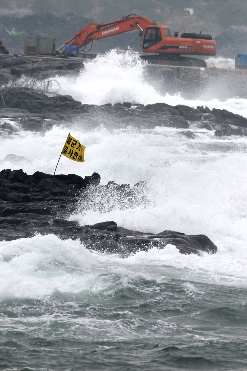 2012년 3월17일 오후 폭풍우가 몰아치는 제주 강정마을 구럼비 바위. 주민들이 꽂아둔 ‘해군기지 결사반대’ 깃발이 바람에 나부끼고 있다.