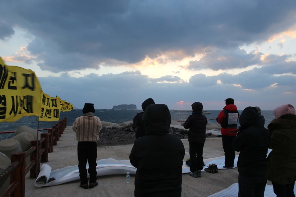 계사년 새해 1일(2013년 1월1일) 오전 제주 서귀포시 강정마을 주민과 평화활동가들이 해맞이를 위해 강정포구를 찾았지만 구름이 끼어 일출을 제대로 볼 수 없었다. 제주도민과 평화활동가들이 해군기지 건설 중단을 기원하며 108배를 하고 있다.