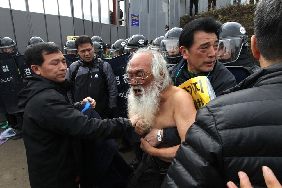 제주해군기지 건설을 위한 구럼비 바위 발파 공사를 두고 주민과 시민단체, 정부가 정면 충돌 양상을 보였다. 2012년 3월8일 오전 강정마을 해군기지 건설 현장 앞에서 윗옷을 벗고 항의시위를 하던 문정현 신부(가운데)가 오열하고 있다.