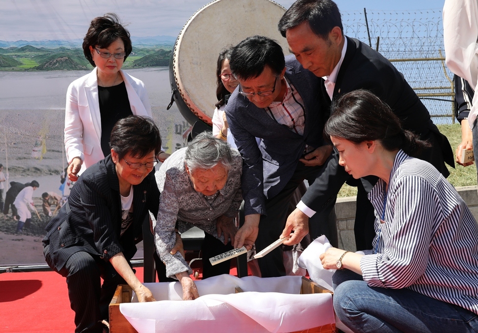 김포매향문화제 참가자들이 통일 뒤 꺼내볼 소원목을 목함에 넣고 있다.