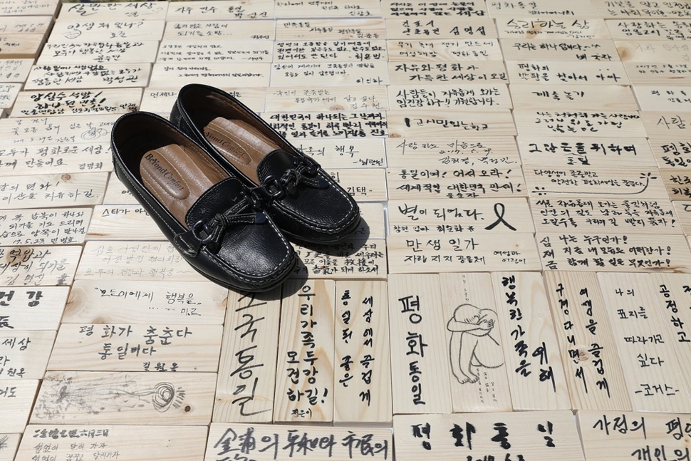 길원옥 할머니가 평소 신던 신발과 시민들의 희망을 담은 소원목이 펼쳐져 있다.