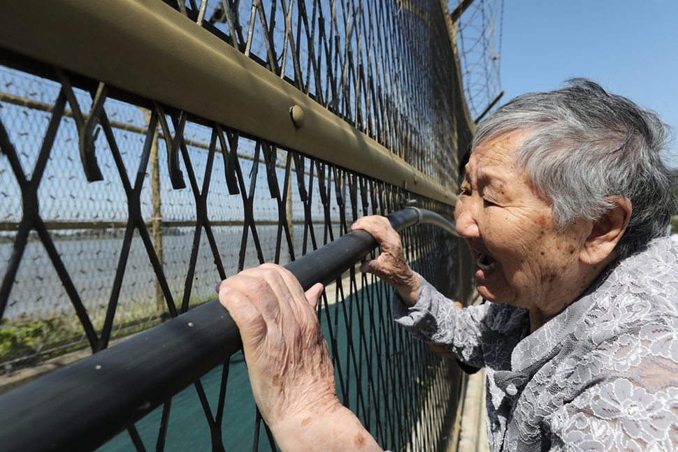 일본군 ‘위안부’ 피해자 길원옥 할머니가 북녘 땅이 바라보이는 경기도 김포시 월곶면 조강리 군 철책 앞에서 슬픔에 잠겨 있다.