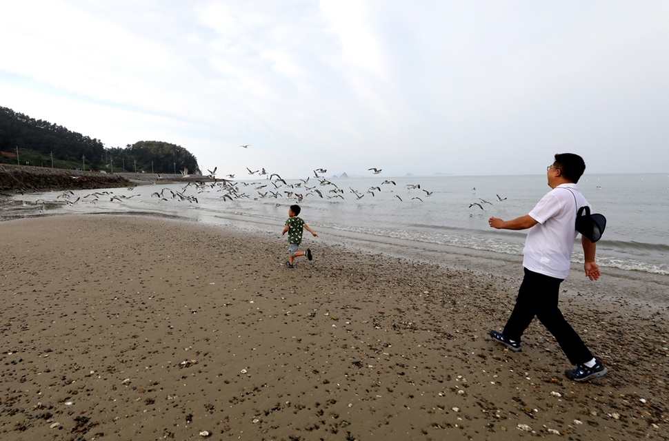 학교 수업이 끝나고 해가 질 무렵, 류찬희 학생과 염대길 선생님이 녹도 해변을 산책하고 있다.