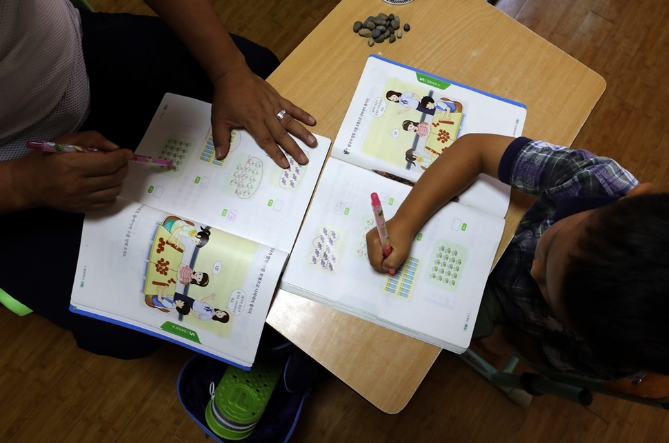 선생님과 찬희가 학습장에서 마주 앉아 수학 문제를 풀고 있다.