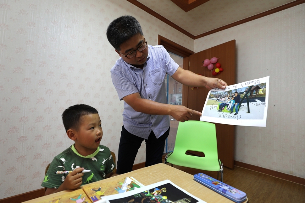 선생님이 가족여행 사진을 보며 발표하는 방법을 찬희에게 가르쳐주고 있다.