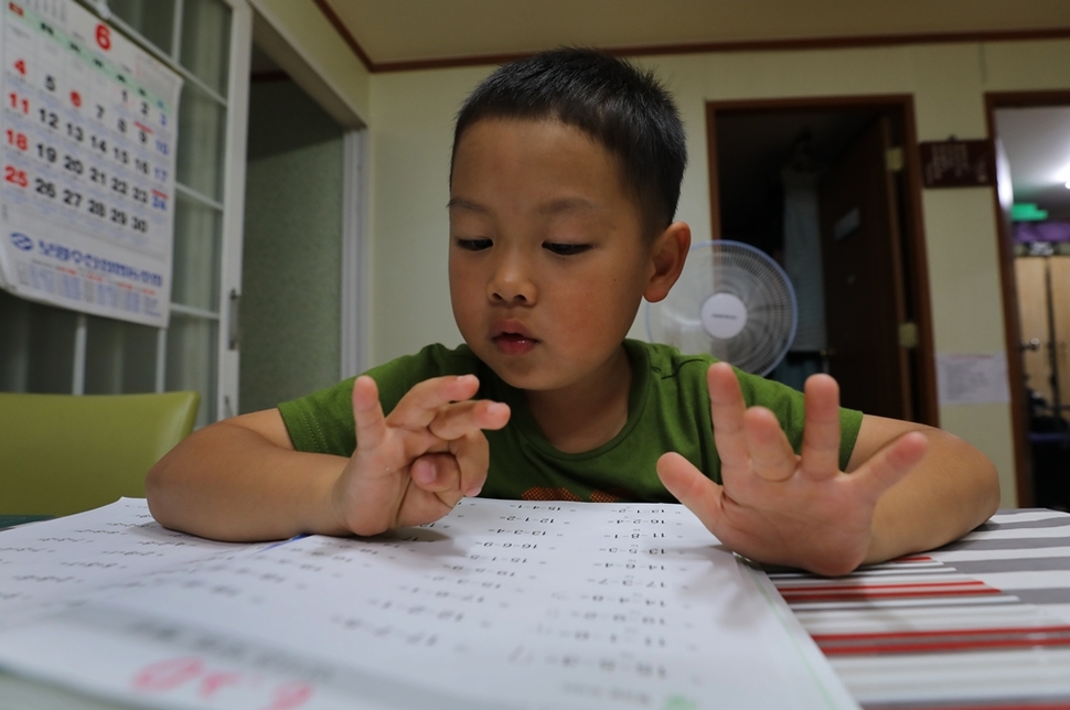찬희가 손을 꼽아가며 수학 문제를 풀고 있다.