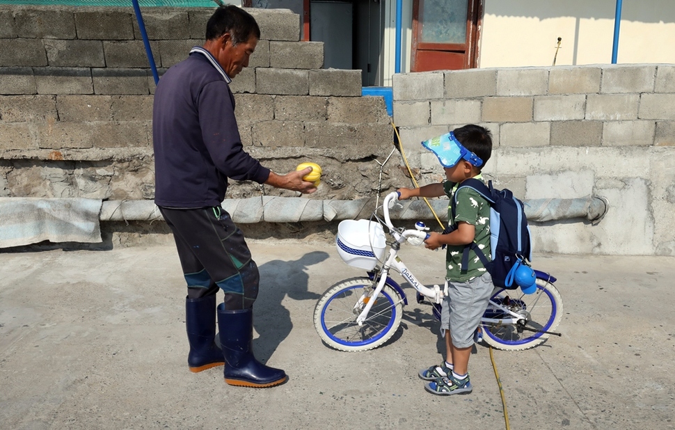 마을 주민이 등교하는 찬희에게 선생님과 함께 먹으라며 참외를 건넨다.