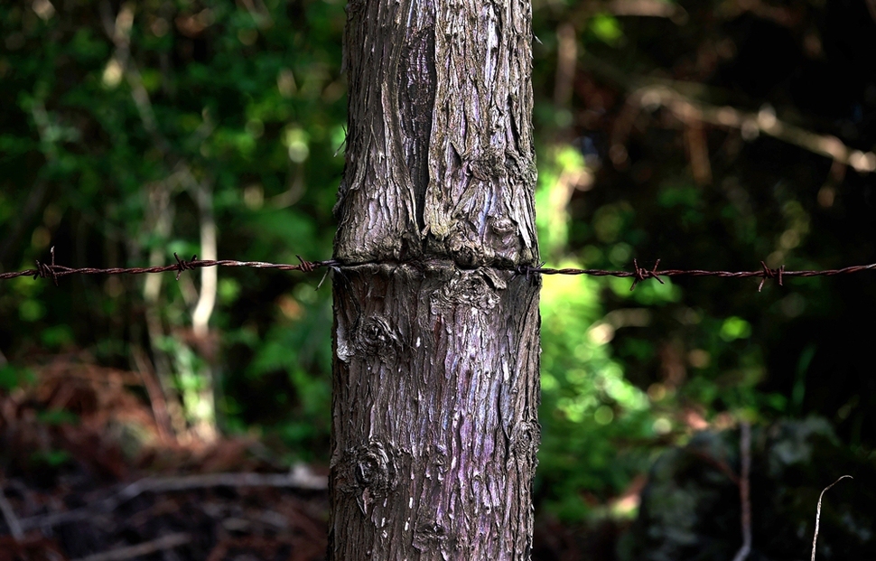 어린 나무 한 그루가 사람들이 쳐놓은 철책과 맞닿아 있었다. 나무는 철책에 스치고 까이며 자라났다. 상처의 아픔은 철책을 품기까지 이어졌을 것이다. 결국 일그러진 나무가 되어서 철책과 함께한다. 이 땅의 주인으로 뿌리내려 철책을 깊이 품으며 죽지 않고 꼿꼿하게 서 있다. 사람들도 이런 아픔 하나쯤 가슴에 품고 살지 않을까.