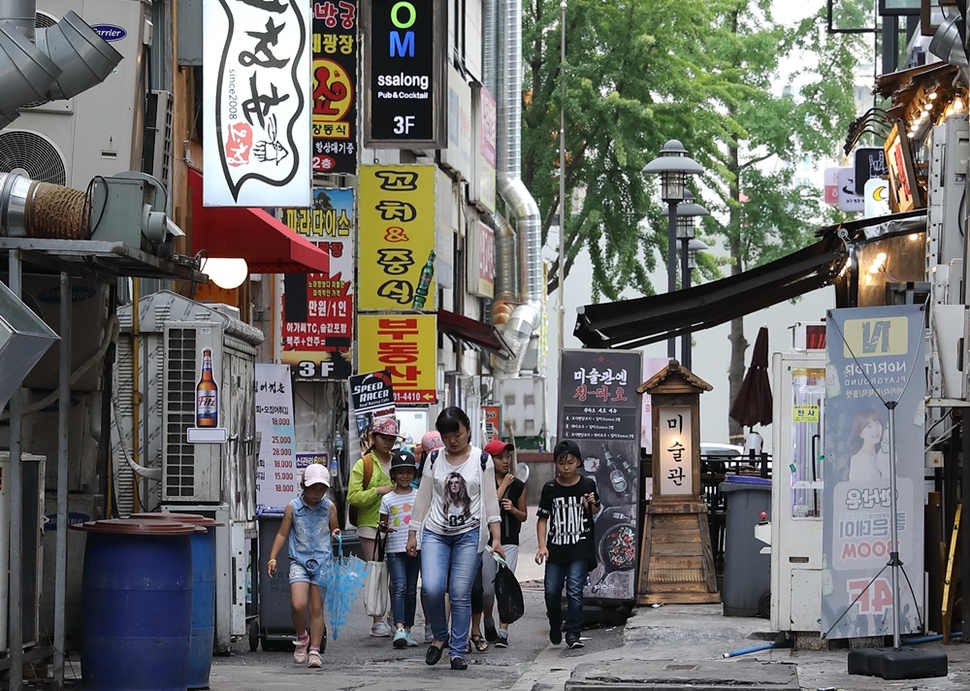 한글 간판이 가득한 상가 지역을 지나가는 아이들.