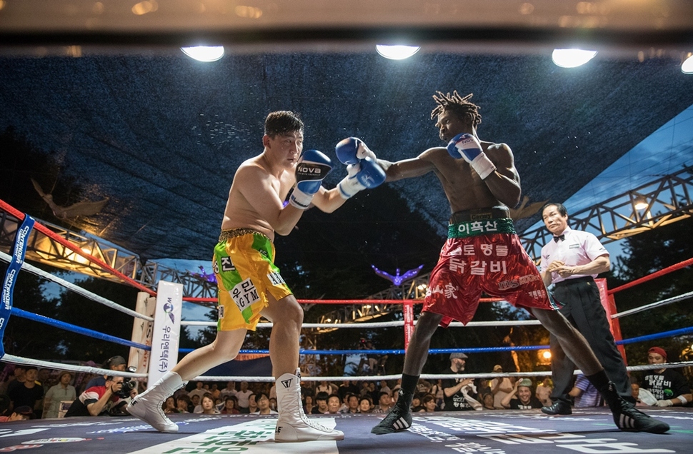닭갈빗집 야외 특설링서 열린 카메룬 출신 난민 챔피언 이흑산의 첫 경기
