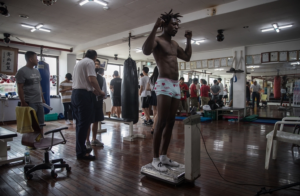 경기 전날 실시되는 계체량에서 통과한 뒤 승리의 포즈를 취한 이흑산 선수.
