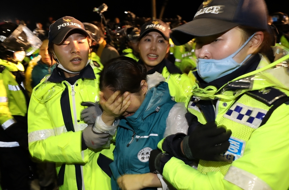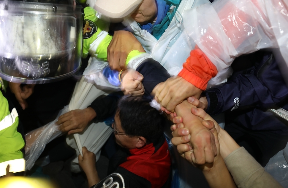집회 참가자와 경찰이 몸싸움을 하고 있다.
