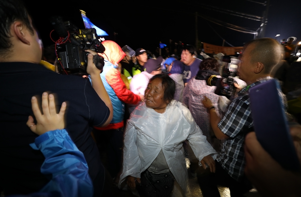 소성리 마을 할머니가 경찰 앞을 가로막았다.