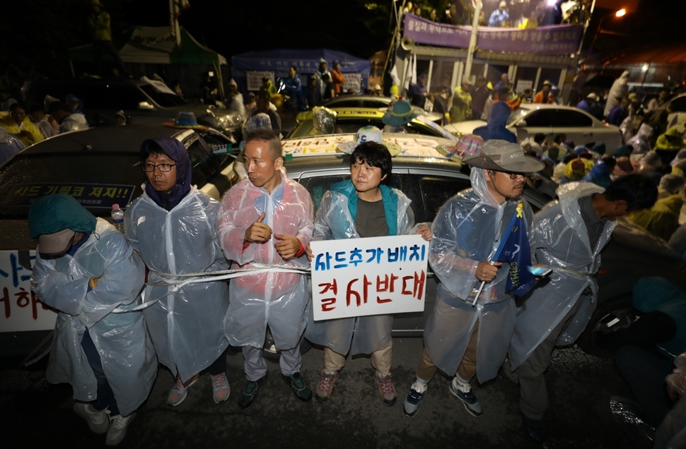 시민들이 밧줄로 서로의 몸을 묶고 사드 발사대 수송차 진입을 막고 있다.
