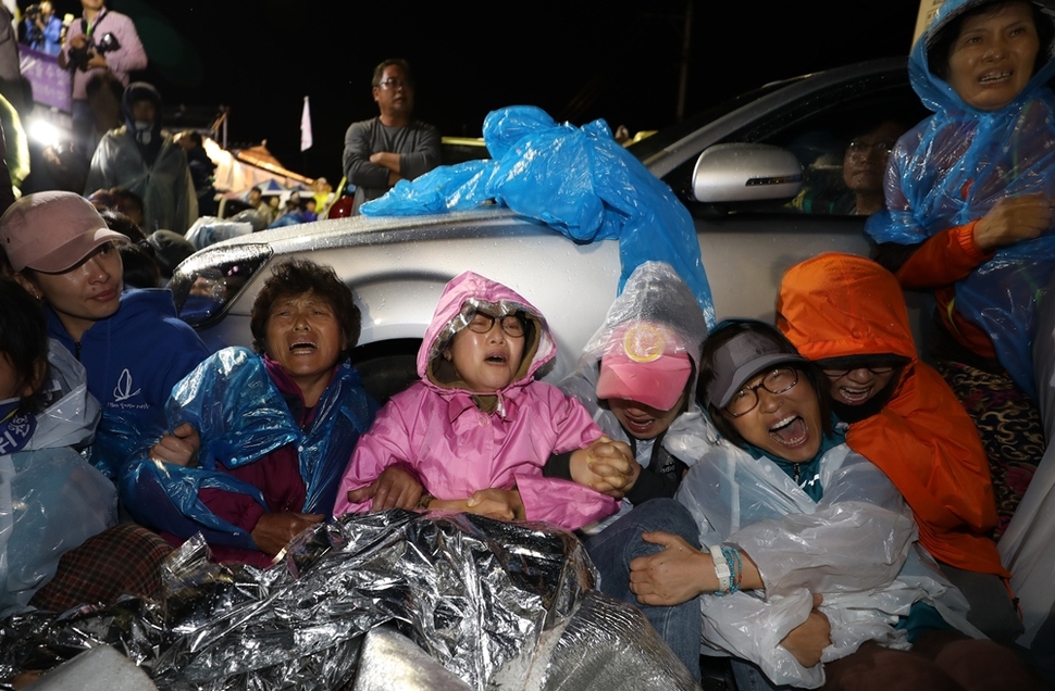 경북 성주군 초전면 소성리 마을회관 앞에서 사드 발사대 수송 행렬을 저지하기 위해 도로를 점거한 집회 참가자들이 경찰 병력이 다가오자 끌려가지 않으려고 서로 팔짱을 끼고 있다.