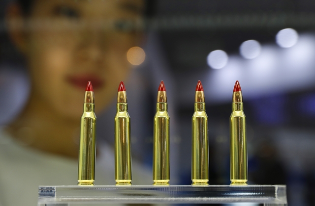 순간 입술연지로 착각했다. 입술에 바르는 빨간색 립스틱 말이다. 무기박람회(서울 아덱스 2017)가 열린 경기도 성남시 수정구 서울공항에서 행사장의 한 도우미가 빨간색으로 표식된 5.56㎜ 소총 총탄을 바라보고 있다. 누구를 향해 쏘아댈지 모르는 이 총탄은 현란한 조명 아래서 구릿빛으로 반짝거린다. 권력자보다는 힘없는 백성이나 하급 사병들의 목숨을 앗아가는 용도로 쓰일 것을 상상하니 머릿속은 처참하고 끔찍스러운 생각으로 가득하다.