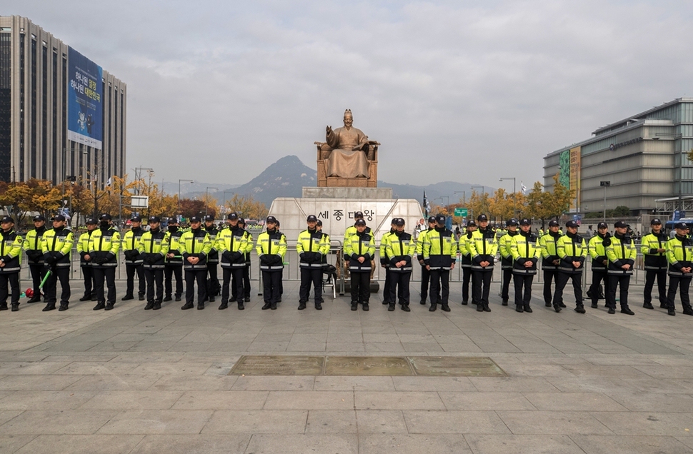 도널드 트럼프 미국 대통령의 방한 기간에 경찰들이 서울 광화문 광장을 지키고 있다.