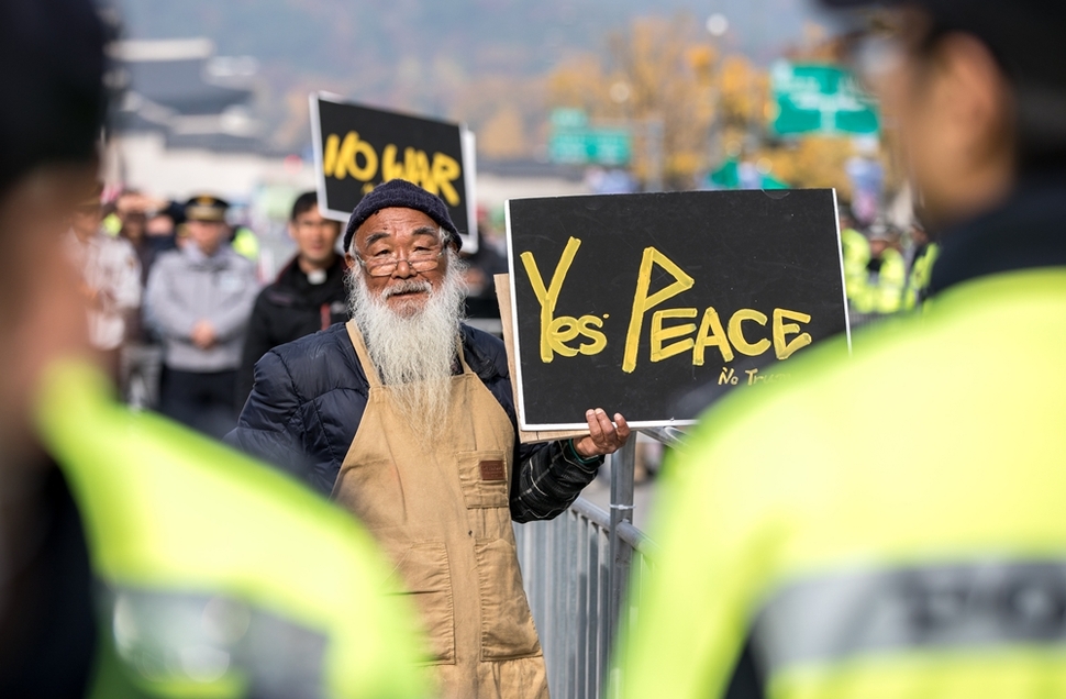 11월7일 문정현 신부가 도널드 트럼프 미국 대통령의 방한을 반대하는 손팻말을 들고 있다.