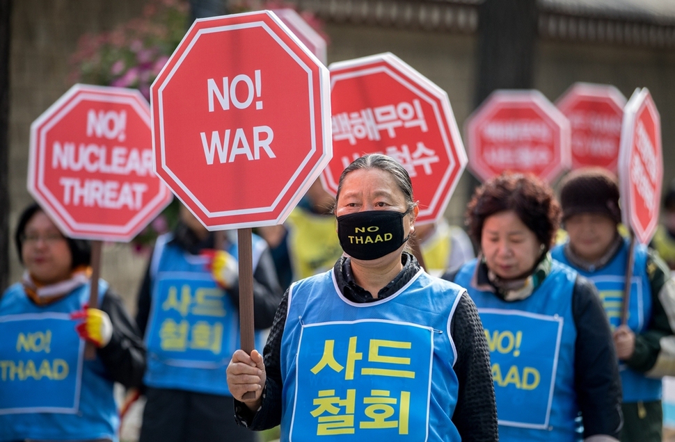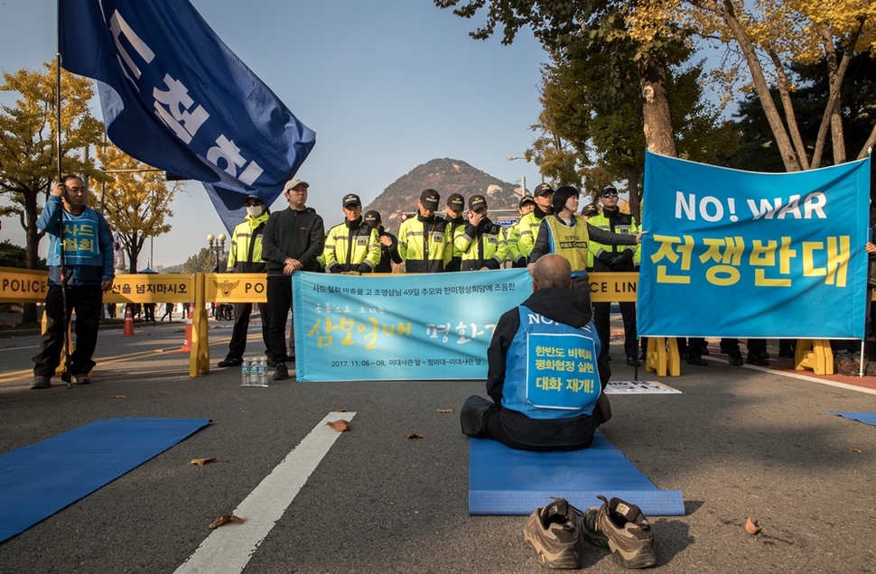 사드(THAAD·고고도미사일방어) 철회를 빌며 삼보일배를 하던 종교인들이 세종로 바닥에 엎드려 있을 때, 트럼프 대통령은 한국에 수십억달러의 무기를 떠넘겼다. 국회의원들의 기립 박수를 받으며 굳건한 한-미 동맹을 연설하는 동안, 국회 담장 밖에선 그의 언행을 믿지 않는 시민들과 그를 환영하는 시민들의 몸싸움이 벌어지고 있었다. 시민단체들은 법원이 허가한 집회조차 할 수 없었다. 광장은 겹겹의 담장으로 막히고 차벽으로 가려져 단절의 공간이 되어버렸다.
