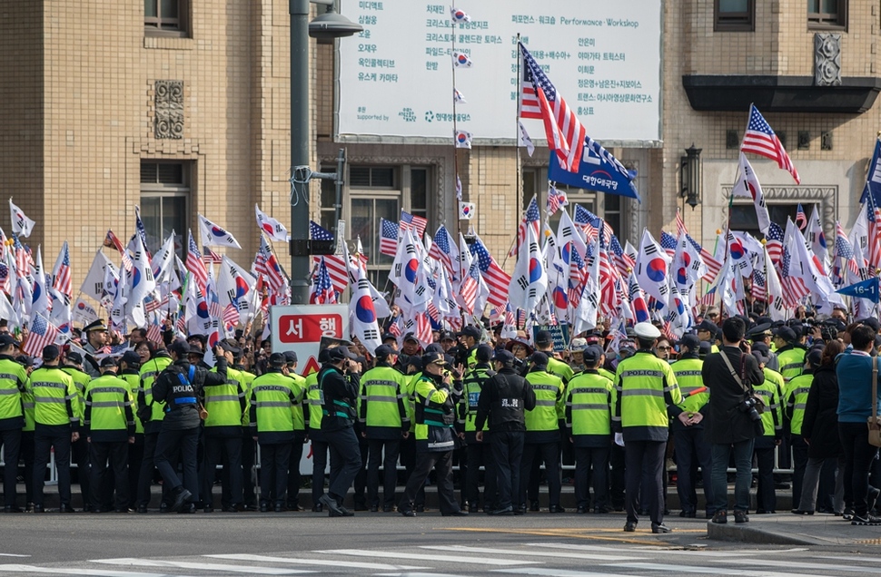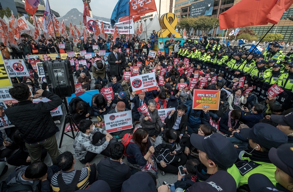 트럼프 미 대통령 방한 찬반 집회 곳곳에서 충돌… 문재인 정부 들어 광화문에 첫 ‘차벽’