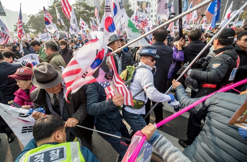 트럼프 방한 반대 집회를 방해하는 보수단체 회원들.