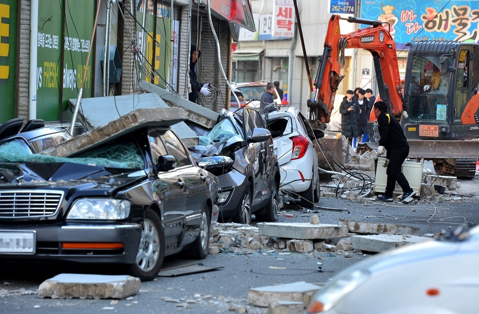 11월15일 경북 포항 흥해읍 마산리 도로에 주차해 있던 차량들이 지진으로 건물에서 떨어진 외벽 조각에 맞아 심하게 파손됐다. (사진 <경상일보> 제공)