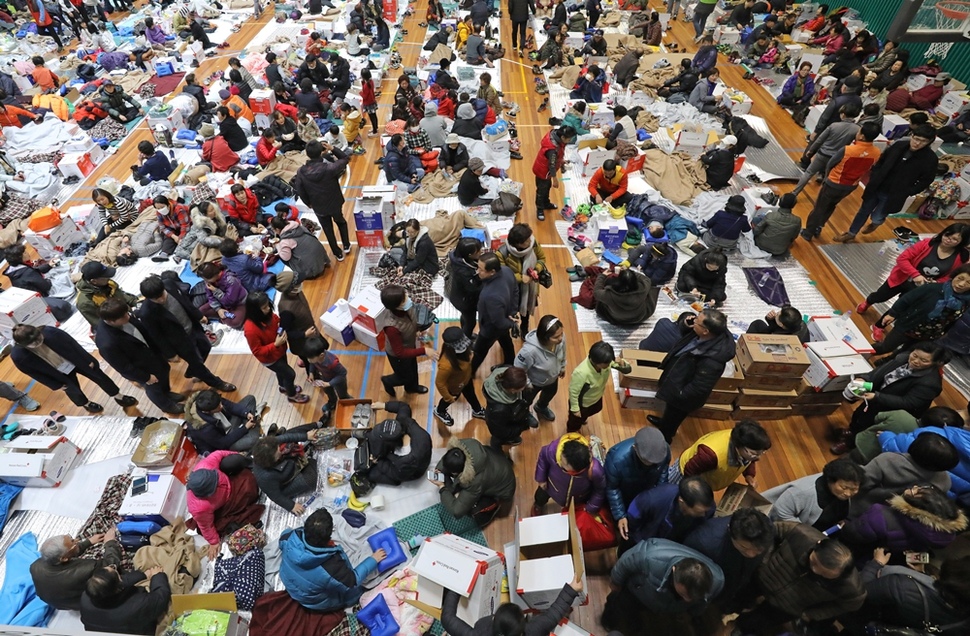 지진 피해를 당한 주민들이 포항 북구 홍해실내체육관에 대피했다.