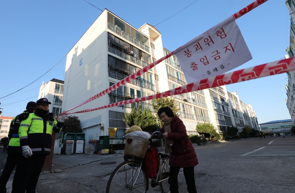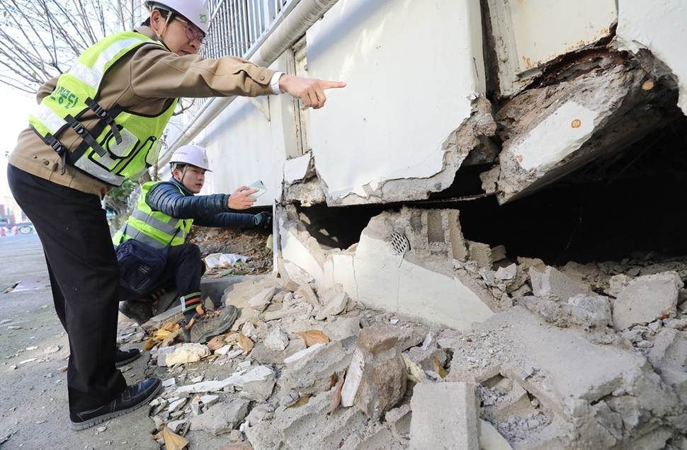 11월16일 오후 한국건축구조기술사회 내진 공학 전문가들과 행정안전부, 포항시 관계자들이 금 가고 부서진 아파트를 점검하고 있다.
