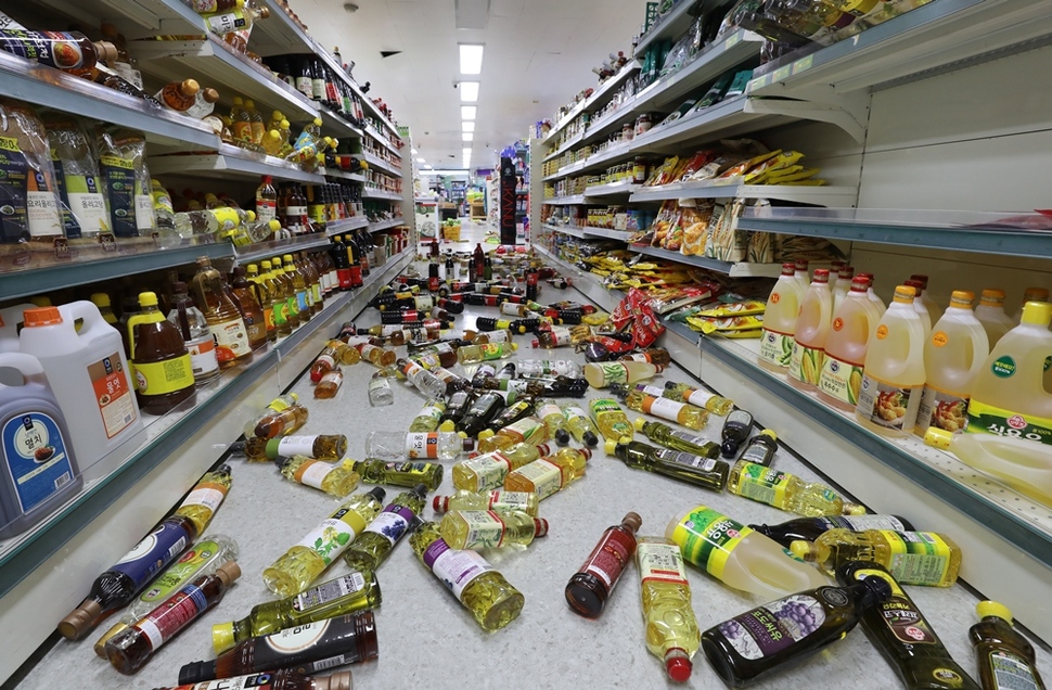 한 마트에서 지진으로 선반에서 떨어진 물건들이 바닥에 흩어져 있다.
