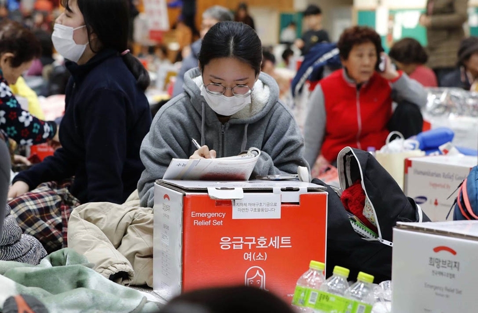 지진이 발생하고 하루가 지난 11월16일, 피해 주민들이 대피한 흥해실내체육관에서 한 수험생이 공부에 열중하고 있다.