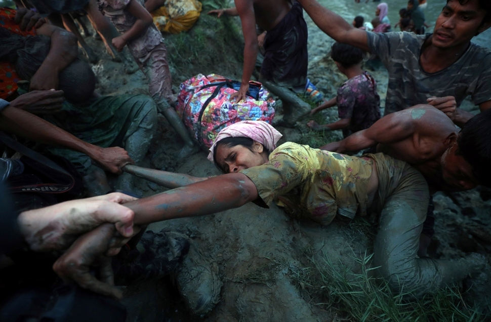 미얀마 정부의 박해를 받는 소수민족 로힝야들이 11월1일 군과 경찰을 피해 미얀마와 방글라데시 국경을 가로지르는 나프강을 건너 방글라데시 팔롱칼리에 도착하고 있다. 한 여성이 제방을 잘 오르지 못하자 이를 지켜보던 사진기자들이 여성의 팔을 잡아 올리고 있다. 로이터