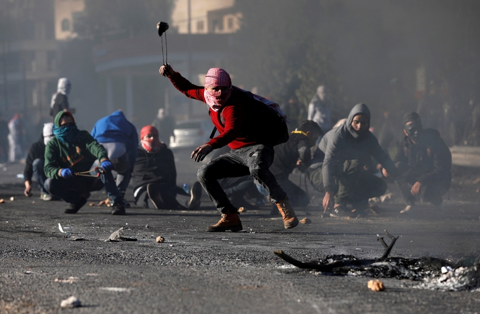 도널드 트럼프 미국 대통령이 예루살렘을 이스라엘의 수도로 인정하는 선언을 한 직후인 12월8일, 성난 팔레스타인 시위대가 서안지구의 베이트엘에 건설된 이스라엘 정착촌에서 이스라엘군에게 돌팔매질을 하고 있다. 트럼프 대통령의 무분별한 언동으로 불안한 중동 정세가 한층 더 짙은 안갯속에 빠져들고 있다. 로이터
