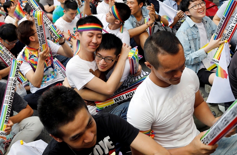 대만 사법원(한국의 대법원)이 동성 결혼을 합법화한 직후인 5월24일, 대만 젊은이들이 타이베이 사법원 청사 앞에 모여 이번 결정을 환영하고 있다. 대만은 이 결정으로 아시아에서 처음 동성 결혼을 인정한 나라가 됐다. 로이터