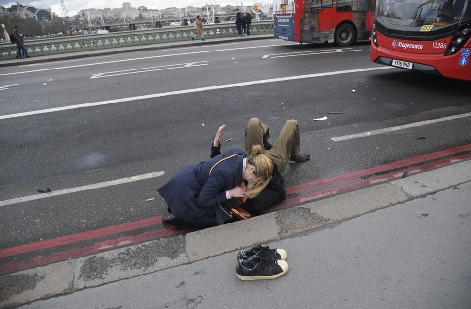 영국 런던에서 4월22일 일어난 차량 테러로 큰 부상을 당한 시민에게 한 여성이 응급조처를 하고 있다. 이 사건을 저지른 칼리드 마수드(52)는 보행자들에게 차를 몰고 돌진해 40여 명을 죽거나 다치게 한 뒤, 런던 의사당에 침입해 경찰관에게 칼을 휘두르다 총에 맞아 숨졌다. 로이터