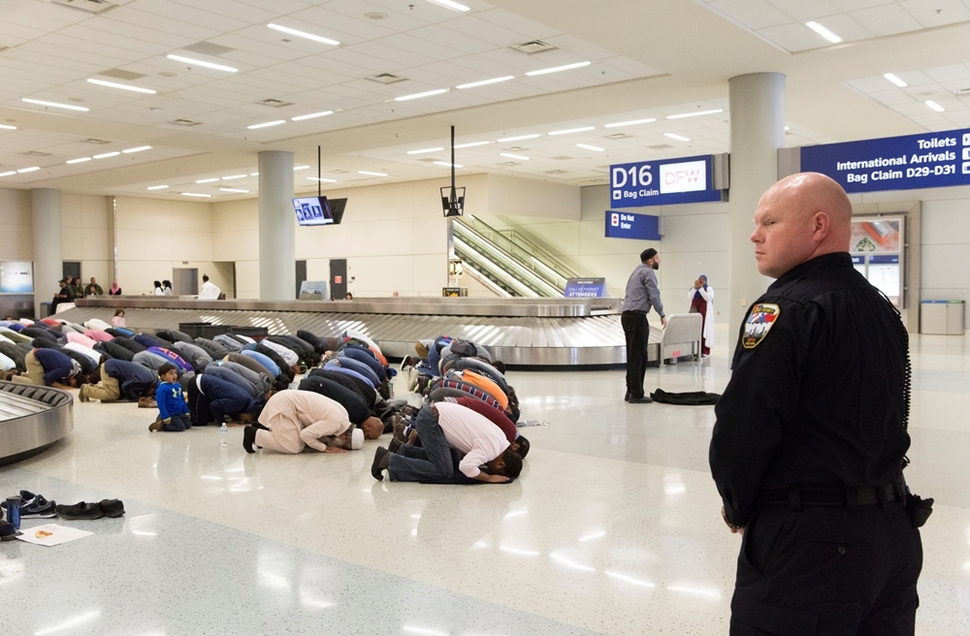 도널드 트럼프 미국 대통령이 이슬람 7개국 국민에게 미국에 90일간 입국할 수 없다는 내용의 행정명령을 내놓자, 이에 반대하는 무슬림들이 1월29일 텍사스 댈러스 국제공항에 도착해 이슬람식 기도를 올리며 항의하고 있다. 로이터