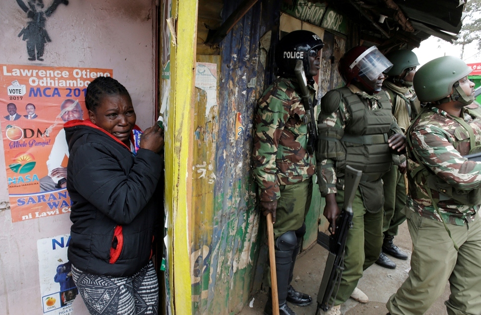 케냐 총선이 열린 8월12일 야당 정치 지도자인 라일라 오딩가 지지자들과 경찰 사이에 유혈 충돌이 일어났다. 수도 나이로비의 한 슬럼가에서 이 모습을 지켜보던 여성이 경찰 뒤로 몸을 피하며 울음을 터뜨리고 있다. 로이터