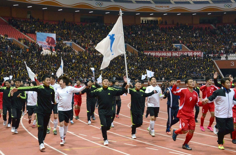 2015년 10월9일 평양 ‘5월1일 경기장’에서 민족의 화해와 단합, 평화와 통일을 위한 남북노동자축구대회가 열리기 앞서 남북 선수단이 한반도기를 함께 들고 입장하고 있다. 조선중앙통신 연합뉴스