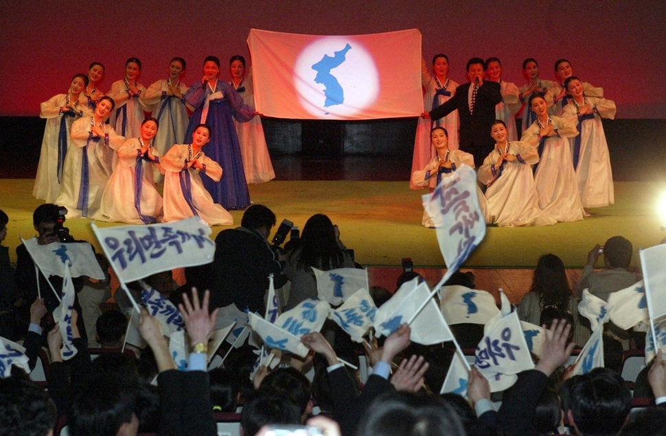 2004년 3월13일 금강산에서 열린 ‘남북금강산새내기배움터’에 참가한 남북 대학생들이 한반도기를 흔들며 북쪽 공연을 관람하고 있다. 금강산/ 연합뉴스