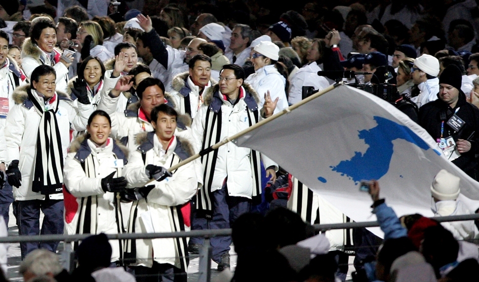 2006년 2월10일 이탈리아 토리노겨울올림픽이 열린 토리노 스타디움에서 남쪽 이보라(왼쪽), 북쪽 한정인 선수가 선수단과 함께 한반도기를 앞세우며 입장하고 있다. 토리노/ 연합뉴스
