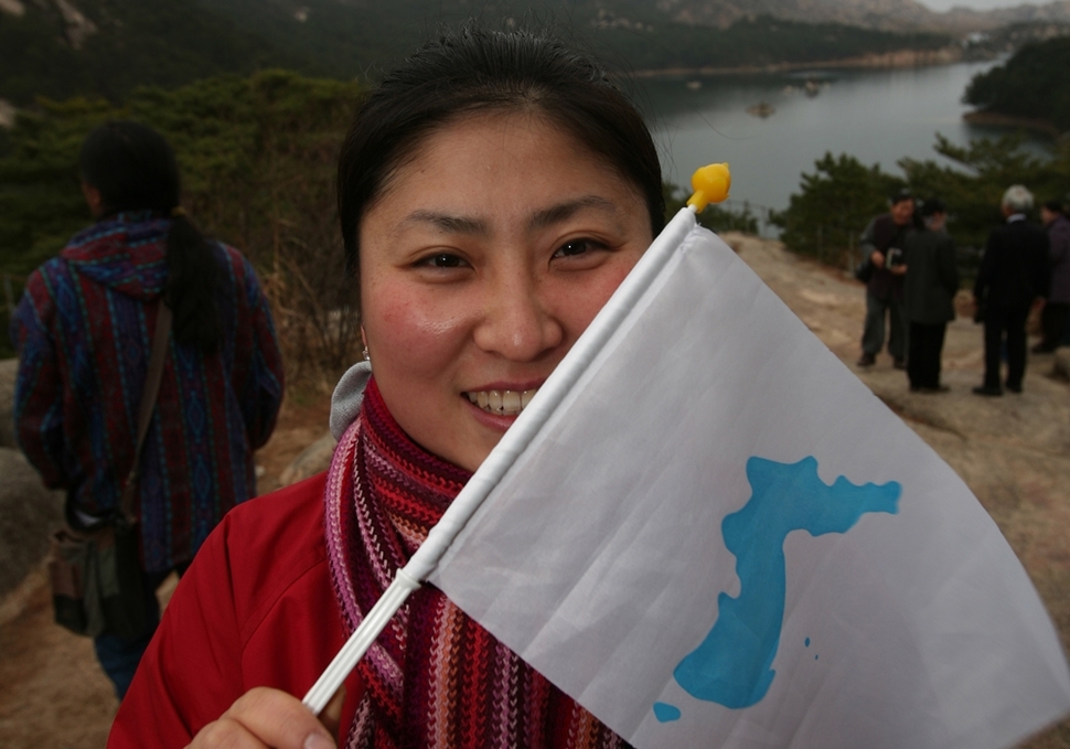 2006년 11월27일 금강산에서 북쪽 안내원이 한반도기를 흔들며 남쪽 관광객들을 맞이하고 있다. 금강산/ 김봉규 선임기자