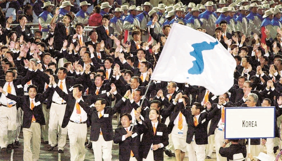 2000년 9월15일 오스트레일리아 시드니올림픽 개막식에서 남북 선수단이 사상 처음으로 ‘코리아’란 이름으로 한반도기를 앞세우고 입장해 뜨거운 박수를 받았다. 시드니/ 사진공동취재단