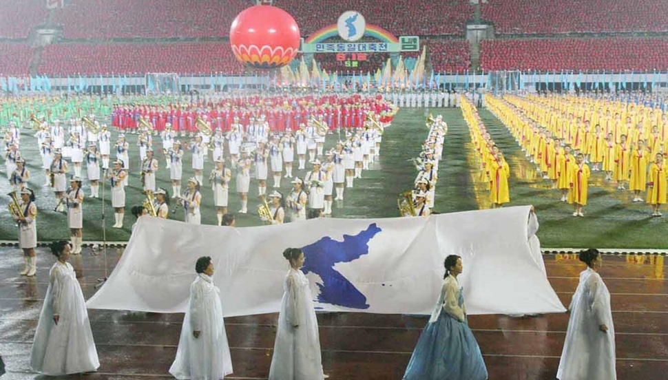 2005년 6월14일 평양 김일성경기장에서 열린 6·15 공동선언발표 5주년기념 민족통일대축전 개막식에 한반도기가 들어오고 있다. 평양/ 사진공동취재단