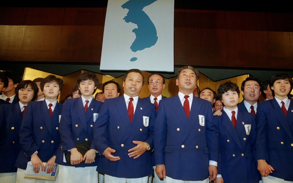 1991년 5월7일 일본 지바에서 열린 세계탁구선수권대회에 남북 단일팀으로 참가한 코리아팀이 도쿄 프린스호텔에서 열린 해단식에 참가하고 있다. 남북 선수들은 한반도기 아래서 <우리의 소원은 통일>을합창했다. 도쿄/ 연합뉴스