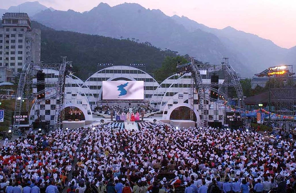 2005년 6월8일 현대아산은 금강산 관광객 100만 돌파를 기념해 금강산 온정각 앞마당 야외 특설무대에서 ‘6·15 공동선언발표 5돌과 금강산 관광객 수 100만명 돌파 기념 남북 공동행사’ 및 한국방송의 금강산 열린음악회를 열었다. 뒤로 금강산과 김정숙 휴양소(왼쪽 건물)가 보인다. 금강산/ 사진공동취재단