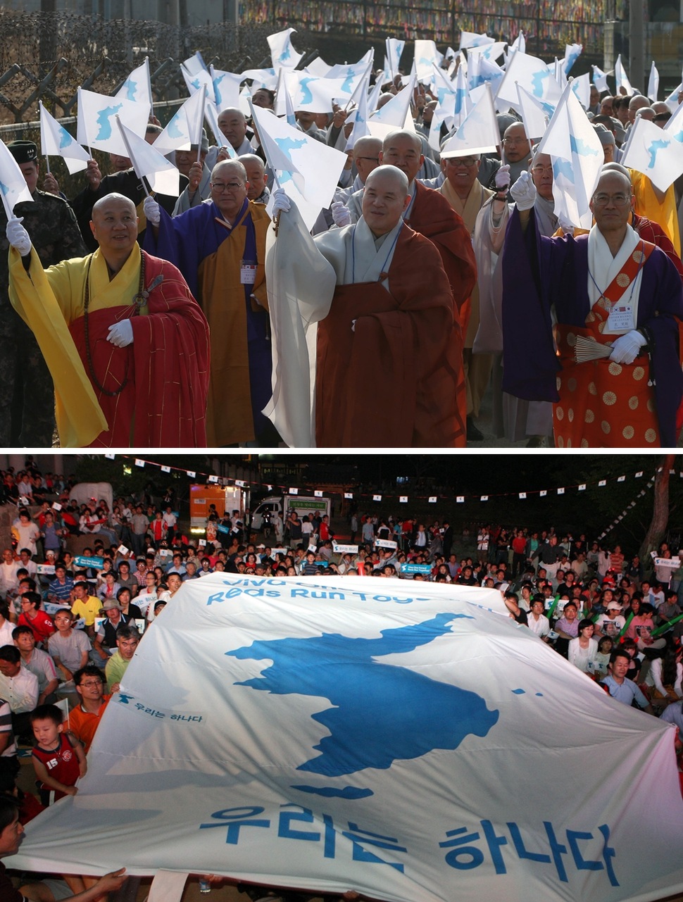 한·중·일 3국 불교지도자 350여 명이 2014년 11월19일 민간인통제지역인 경기도 파주 도라산 전망대에서 ‘한반도 및 세계평화 기원법회’를 열었다. 법회에 앞서 스님들은 ‘평화로운 한반도, 조화로운 세계’라는 펼침막과 한반도기를 들고 임진각에서 통일대교까지 행진했다.(위) 한겨레 강재훈 선임기자/ 2010년 6월21일 서울 강남구 삼성동 봉은사에서 시민들이 남아공월드컵경기 북한-포르투갈전 관람에 앞서 한반도기를 흔들며 응원하고 있다. 도라산전망대/ 한겨레 신소영 기자