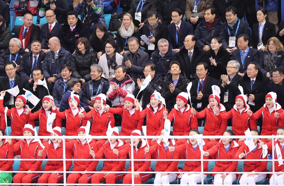 문재인 대통령과 남쪽 인사들, 토마스 바흐 국제올림픽위원회(IOC) 위원장, 김여정 북한 노동당 중앙위원회 제1부부장, 김영남 최고인민회의 상임위원장, 북쪽 특사단이 남북 단일팀 여자 아이스하키 경기가 열린 관동하키센터에서 남북 응원단과 함께 응원하고 있다.