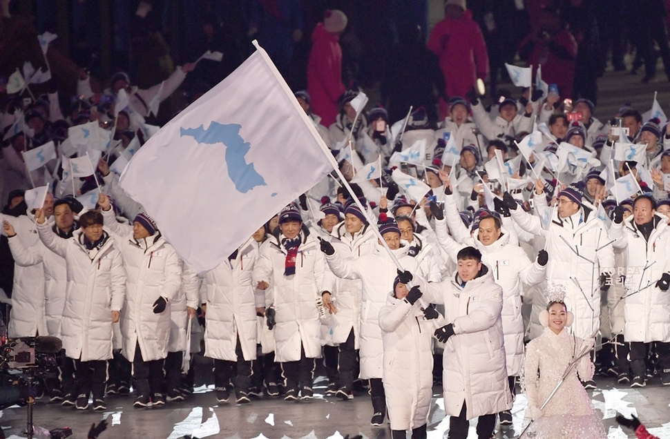 남북 단일팀 선수들이 한반도기를 들고 개막식장에 들어서고 있다.