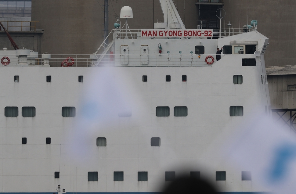 2월9일 오전 강원도 동해시 묵호항에서 아리랑 응원단 소속 시민들이 북한 예술단을 태우고 입항한 만경봉92호를 바라보며 한반도기를 흔들고 있다.