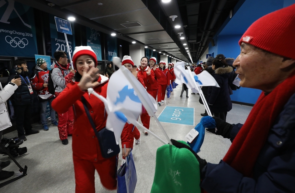 한반도기를 손에 든 남한 시민이 북한 응원단과 인사하고 있다.